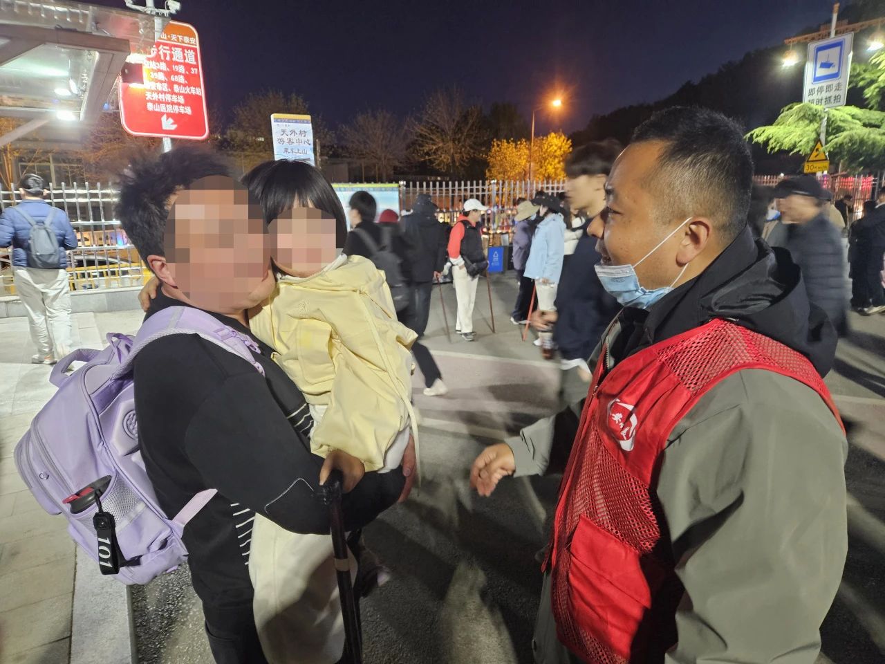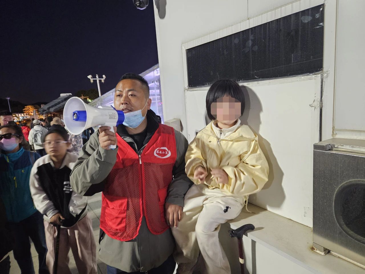 據(jù)了解,19時(shí)許,志愿者王路路和其他志愿者在樞紐站維護(hù)乘車(chē)秩序時(shí),發(fā)現(xiàn)一名身著米黃色外套的小女孩獨(dú)自站在角落哭泣。王路路立即上前安撫,得知孩子與父親下山后不慎走失,他試圖詢(xún)問(wèn)孩子父母的聯(lián)系方式以便快速尋找,但由于孩子年齡太小,記不住父母手機(jī)號(hào)。于是,王路路通過(guò)廣播尋人,并撥打110報(bào)警尋求幫助。在尋找過(guò)程中,他不忘輕聲安慰小女孩:“小朋友不哭,叔叔幫你找爸爸,爸爸很快就來(lái)啦!”在志愿者的安撫下,孩子逐漸平靜下來(lái)。