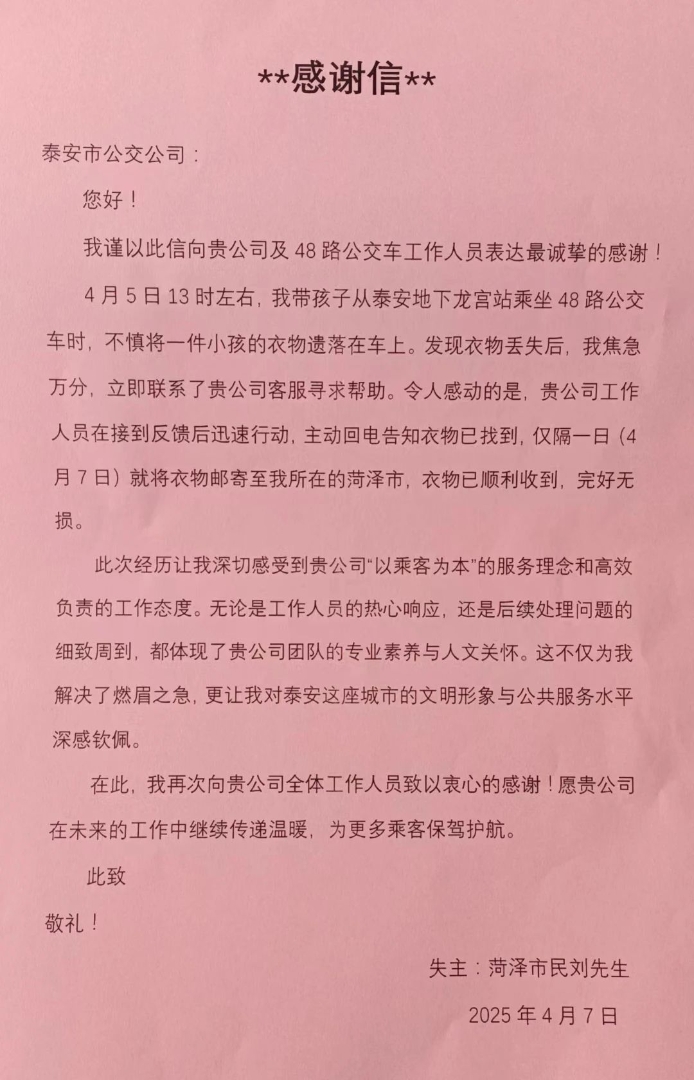 第二天,劉先生收到孩子丟失的衣服后十分感動,便寫了一封感謝信寄到第三分公司,對48路公交駕駛員及分公司工作人員表示感謝。同時,劉先生還表示,在泰安游玩得很開心。乘坐48路公交車時,駕駛員服務(wù)周到,細(xì)心幫助規(guī)劃路線;到各個景點游玩時,工作人員服務(wù)都很熱情,這次假期在泰安旅游留下了美好的印象。