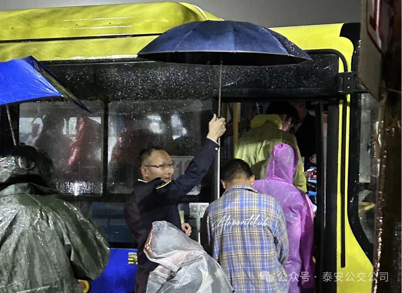 同樣是10月4日,夜幕比往常來(lái)得更早一些。傍晚時(shí)分,雨絲突然密集起來(lái),像珠簾般砸向地面,桃花峪公交樞紐站的路面很快積起淺淺的水洼。下山的游客們抱著行李、牽著孩子,站在站臺(tái)下有些慌亂,直到一個(gè)身著深藍(lán)色制服的身影撐著傘走了過(guò)來(lái)——他是泰安公交泰山百合志愿者,也是這個(gè)雨夜最溫暖的“守護(hù)者”。
